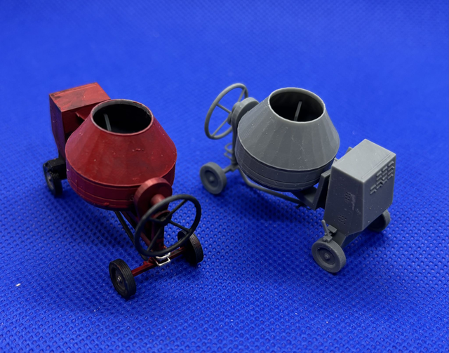 A single cement mixer with draw bar under drum. The cement mixer supplied as one piece 3D print.
