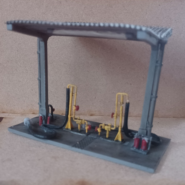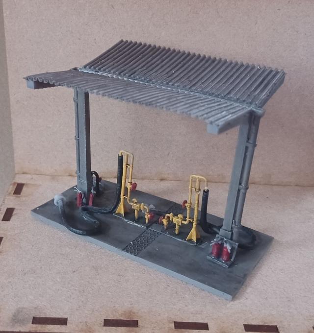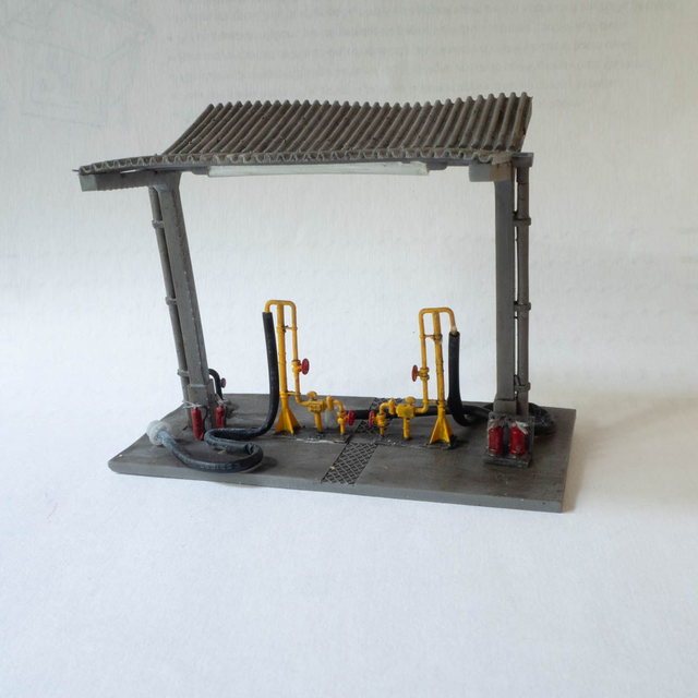 4mm scale / 00 locmotive re-fueling shelter kit, with fuel equipment, hoses and fire extinguishers. Features 'clear' light shade suitable for white micro-LED (not supplied).