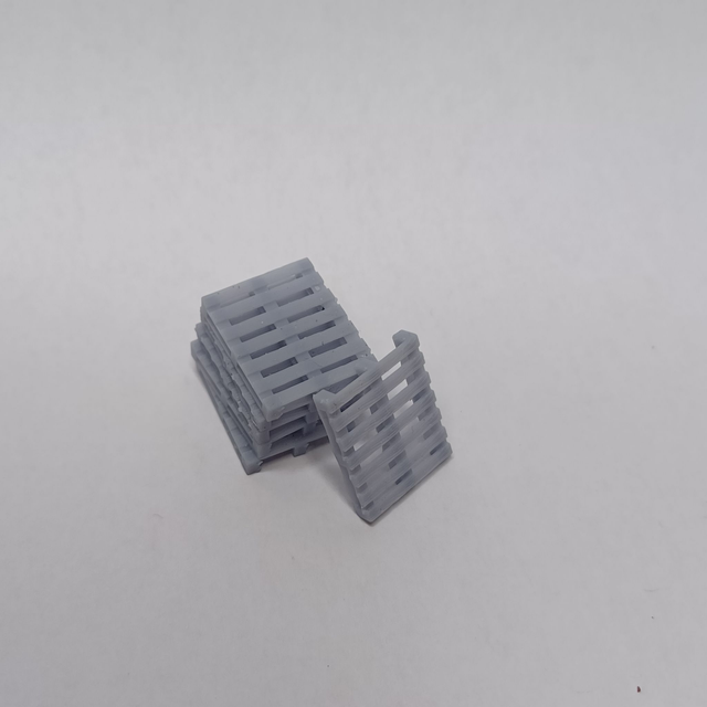 4mm scale / 00 gauge Euro style pallets. 3D resin printed, supplied unpainted as pack of 6. Painted for reference only. See also broken pallets. Ideal for depot / goods yard detailing