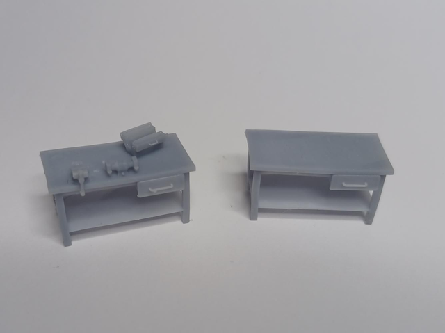 4mm scale / 00 workbench pair, one with vice, grinder and toolbox. 3D resin printed supplied unpainted. Suitable for depots / workshops.