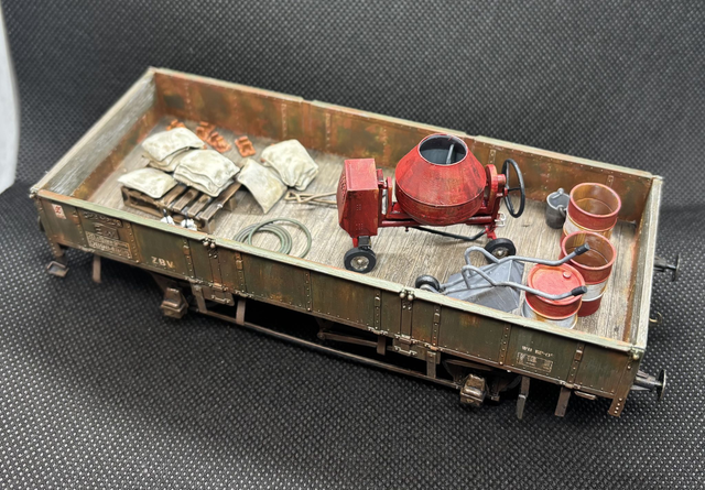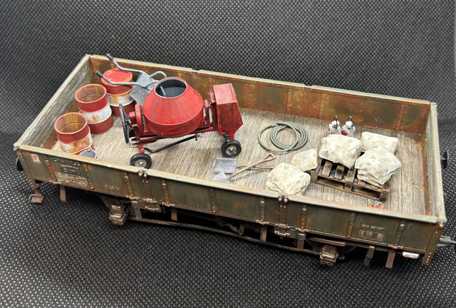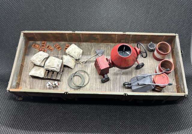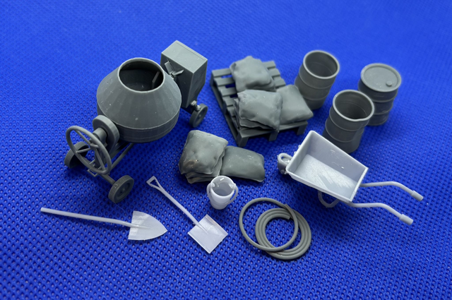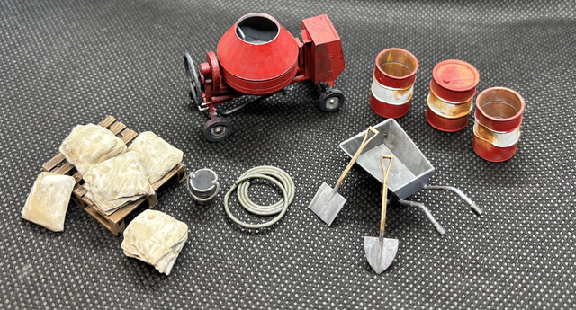 A kit comprising a cement mixer (draw bar under drum), cement bags, 2 open end oil drums (for 'water), oil drum, wheelbarrow, hose pipe coil and two spades for either line side or permanent way wagon load. The cement mixer supplied as one piece 3D print. One open oil drum as a 'dented' side as part of the print.