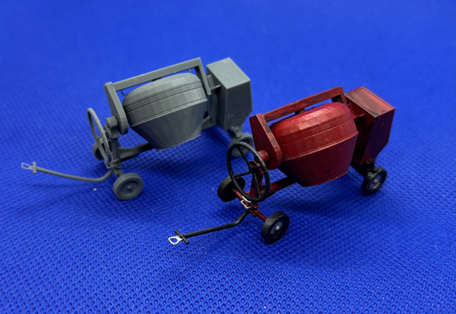 A single cement mixer with draw bar extended. The cement mixer supplied as one piece 3D print.