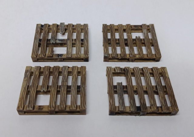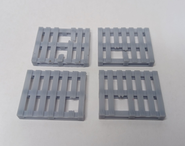 7mm scale / 0 gauge Euro style 'BROKEN' pallets. 3D resin printed, supplied unpainted as pack of 4, different types. Painted for reference only. See also Euro pallets. Ideal for depot / goods yard detailing