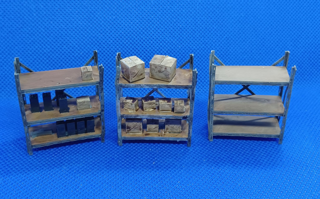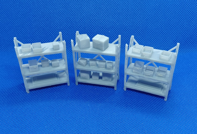 7mm scale / 0 gauge ' Dexion' style racking for depot or warehouse detailing etc. Each with three shelves and with various items, eg boxes, crates, batteries etc.